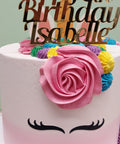 Layers of our decadent mud cake, filled with a ganache of your choosing, covered with vanilla buttercream, and finished with colourful vanilla buttercream swirls. Adding the finishing touches of edible gold painted eyes, horn and ears and a customisable gold acrylic topper.
